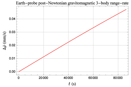 We considered just Enceladus and Europa because they are of great planetological interest in view of the possible habitability of their oceans beneath their icy crusts [21]. As a consequence, they are the natural targets of several concept studies and proposals for dedicated missions to them, including also orbiters [22,23,24,25,26]. Since, at present, sending a spacecraft to Europa seems more likely than to Enceladus, as it can be learnt at https://europa.nasa.gov/about-clipper/overview/ and http://sci.esa.int/juice/ on the Internet, we investigated in a little more detail this potentially appealing Jovian scenario, even if it is not said that the actually approved missions will finally involve the use of an orbiter. In such kind of endeavours, the observable quantity is typically the Earth-probe range-rate , whose accuracy for, e.g., the ongoing mission Juno [27] around Jupiter is [28]. Figure 2 shows the numerically simulated Earth-spacecraft range-rate signature due to the pN gravitomagnetic 3-body acceleration of Equation (18) for a generic orbital configuration of the hypothesized orbiter. To produce it, we numerically integrated the equations of motion in Cartesian rectangular coordinates of the Earth, Jupiter, its Galilean moons and a fictitious test particle orbiting Europa over 1 d. In both runs, sharing the same initial conditions retrieved from the database JPL HORIZONS (https://ssd.jpl.nasa.gov/?horizons) at the arbitrary epoch of midnight on 1 January 2030, we modeled the mutual attractions among all the bodies involved to the Newtonian level, with the exception of Equation (18) which was added to the other classical gravitational pulls felt by the probe in one of the runs. Then, we numerically calculated two range-rate time series, with and without Equation (18) ceteris paribus, and subtracted the purely Newtonian one from that including also the pN gravitomagnetic acceleration. It can be noted that, for the orbital configuration chosen, the range-rate relativistic signature reaches the level after just 1 d. Thus, the scenario considered seems worthy of further, dedicated analyses investigating the actual measurability of Equation (18) in a realistic error budget analysis and mission proposal. It should take into account several concurring perturbations of gravitational and non-gravitational nature, and also several technological and engineering issues.