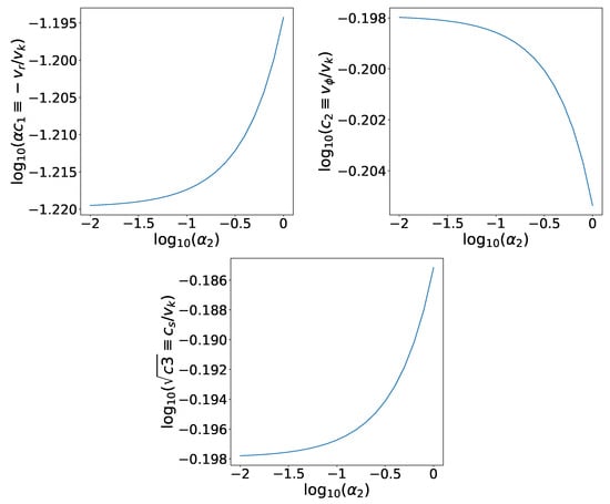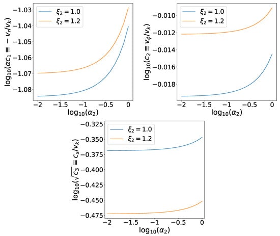 In this subsection, we focus on the case where outflows are absent. In this case, the parameter . We show the results in Figure 1. The top-left panel plots radial infall velocity (in units of Keplerian velocity) as a function of the strength of anisotropic pressure (). The top-right panel plots rotational velocity (in units of Keplerian velocity) as a function of the strength of anisotropic pressure (). The lower panel plots sound speed (in units of Keplerian velocity) as a function of the strength of anisotropic pressure (). The viscous coefficient was set to be 0.1. The ratio of magnetic to gas pressure was set to be 0.1. For the self-similar solution, at any radii, the ratio of velocities to Keplerian velocity was constant. In the figure, we plot the ratio of velocities to Keplerian velocity; therefore, the results (velocities plotted in the top-left panel of Figure 1) can be applied at any radii.