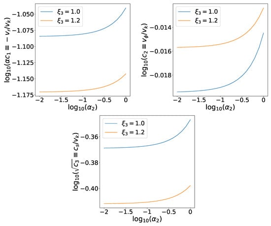 The last term on the right-hand side of the radial momentum Equation (19) is the force of divergence of anisotropic pressure. It is clear, when , that the force is negative; this force points towards the central black hole. Therefore, from the top-left panel of Figure 1, we see that with the increase of strength of anisotropic pressure, the radial infall velocity of the accretion flow increases. If outflow is absent, viscosity due to turbulent magnetic field is the only mechanism for angular momentum transfer (see Equations (14) and (20)). The inward advection of angular momentum by inflowing gas is balanced by the outward angular momentum transportation by viscosity. With the increase of radial infall velocity, the inward advection of angular momentum flux increases (see Equation (20)). Correspondingly, the outward angular momentum flux also needs to increase. The increase of outward angular momentum flux can be realized by increasing the sound speed (see Equation (20)), because the viscosity T is proportional to . Therefore, with the increase of strength of anisotropic pressure, the sound speed (or gas temperature) becomes bigger. From the energy Equation (22), we see that the viscous heating (first term on the right-hand side) and heating due to work done by anisotropic pressure (second term on the right-hand side) are balanced by the advection of energy by the inflow (first term on the left-hand side). With the increase of , heating due to work done by anisotropic pressure increases faster than the increase of energy advection. Therefore, in order to keep the accretion flow stable, the viscous heating term needs to decrease with an increase of . Therefore, with an increase of , the rotational velocity decreases.