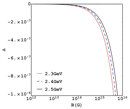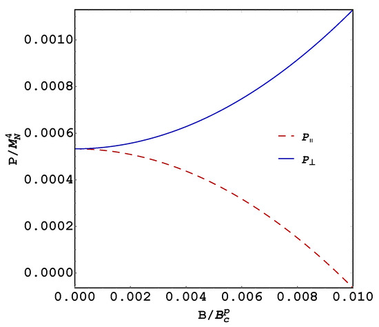 Using Equation (19), the parallel and transverse pressures are plotted versus the magnetic field in Figure 1, for a chemical potential GeV. The chemical potential value GeV is needed to produce positive pressures at small field values. We found that the contribution of the QFT thermodynamic potential substantially depletes the pressures making necessary a higher Fermi pressure to produce a net positive pressure, which is necessary to compensate for the gravitational pull. We notice that, while the perpendicular pressure increases with the magnetic field, the parallel pressure decays monotonically due to the negative sign of its Maxwell term and has a root at ( GeV) G, which is two orders smaller than ( GeV) G obtained from Equation (17).