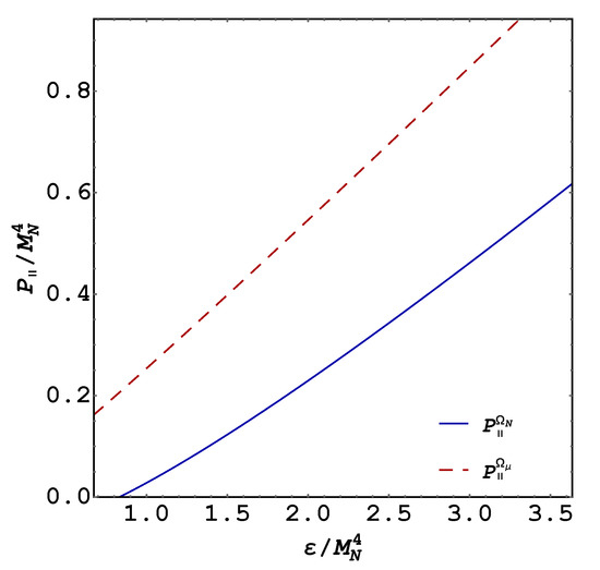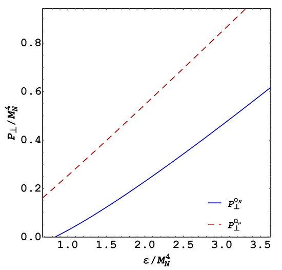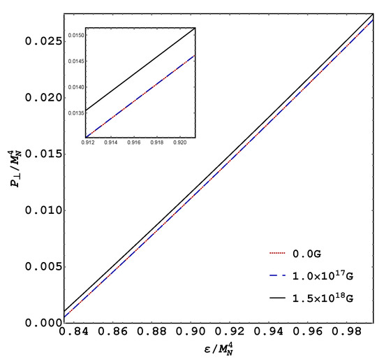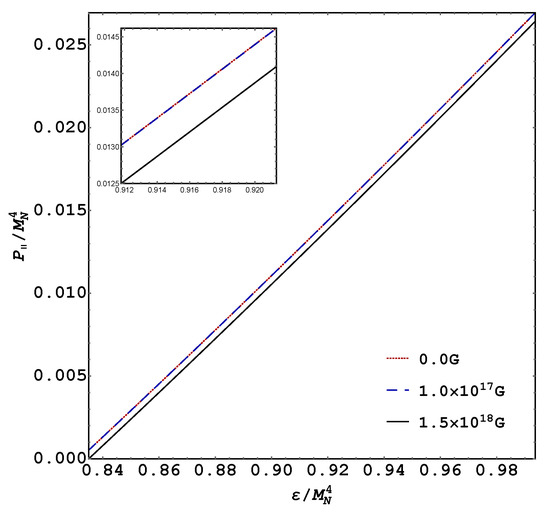 Here, the following comment is in order. Because neutrons in a magnetic field do not suffer the softening in pressure caused by Landau quantization, it has been found following an isotropic approach and neglecting the Maxwell pressure (i.e., considering in Equation (19) without the and terms) that the magnetic field, through its interaction with the neutron magnetic moment, stiffens the system EOS [13] for fields of order G. However, as shown above, due to the pressure anisotropy produced by the magnetic field [11,12,13,14], the situation is more subtle in the sense that at the magnetic-field strength that was needed to produce significant stiffening of the isotropic EOS, the longitudinal pressure vanishes creating a loss of balance with the gravitational pull in the neutron star. Moreover, because of the softening effect of the QFT contribution, we found that the net magnetic field effect is to soften the system EOS, as can be seen in Figure 2 and Figure 3 for the parallel and transverse pressures, respectively.