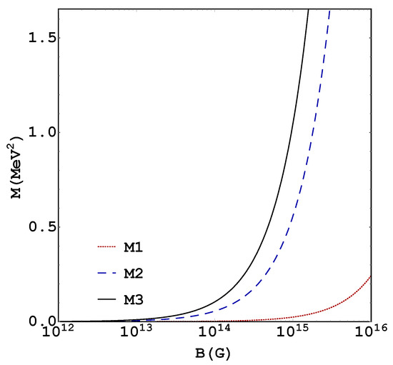 Here, we also proved that the magnetization of this system gets a significant contribution from the magnetized vacuum. This is a consequence of the appearance of terms that combine the magnetic field with the energy scale of this non-renormalizable model. Other situations where the energy scale makes significant contributions in magnetized systems can be found in the value of the chiral condensate of the Nambu–Jona–Lasinio version of QCD [26,27] and in the gap of the magnetic color–flavor–locking phase of color superconductivity [28,29,30]. All this indicates that, in finding the system magnetization at moderately large magnetic fields, neither the particle-contribution alone (given by the curve M2 in Figure 7), nor the calculation from the system polarization (Equation (28)) (given by the curve M1 in Figure 7) will be correct.
