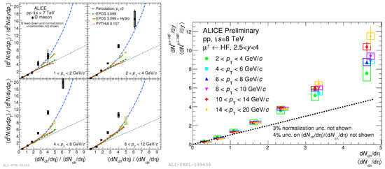 (Left) Average self-normalized yields of D mesons in pp collisions at TeV at mid-rapidity [9], compared to several model calculations [10,11,12], and (right) of muons in pp collisions at TeV at forward rapidity, for several transverse momentum ranges.