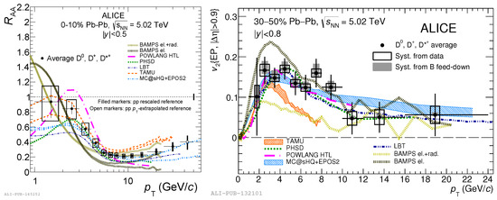 (Left) Average nuclear modification factor of , and mesons in central Pb-Pb collisions at TeV [23], compared to transport model calculations [24,25,26,27,28]. (Right) Average azimuthal anisotropy of D mesons in semi-central Pb-Pb collisions at TeV [29], compared to model calculations [24,25,26,27,28].