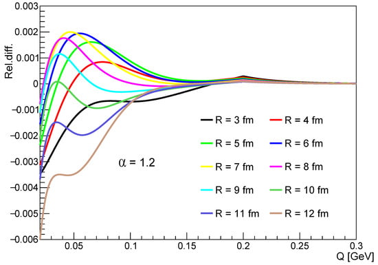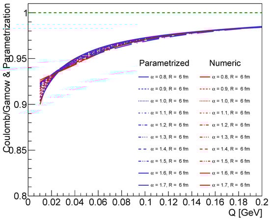 This parametrization describes the R and dependence of the Coulomb integral in a range where the Coulomb correction deviates from 1 by more than a factor of ∼10–10. We find that this region is 0 GeV/c 0.2 GeV/c. As an example, for fm and with different values, we plotted the results of the parametrization on Figure 1.
