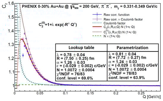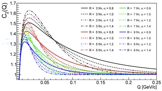 We used this formula to reproduce PHENIX results Ref. [5] 4; this can be seen on Figure 2. The two fits are compatible with each other. For an example code calculating the formula of (31), please see Ref. [11]. Example curves resulting from the above (32) formula (with the background being unity) are shown in Figure 3. These clearly show how R changes the scale, and changes the shape of the correlation functions. Parameter provides an overall normalization to the distance of these curves from unity, as described by Equation (32).
