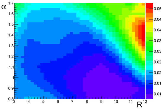 We investigated the parametrization by means of its relative deviation from the lookup table. The results can be seen in Figure 4. In the case when with different R values, we present a two-dimensional histogram of the relative differences in in Figure 5. The maximum of these relative differences is around 0.05%.