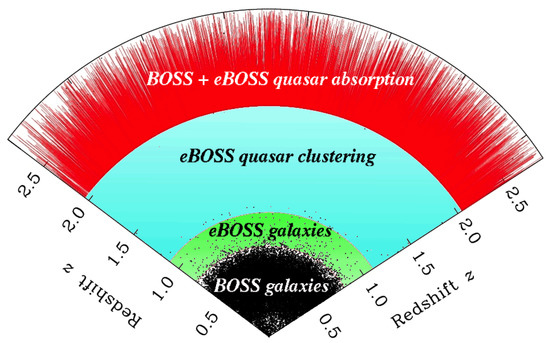 300,000 luminous red galaxies (LRG) will be observed over 7500 deg in the redshift range , 189,000 emission line galaxies (ELG) over 1000 deg in the range and 573,000 quasars over 7500 deg in the range . This large catalog will produce 1–2% distance measurements from baryon acoustic oscillations in the redshift range . At this time, the Data Release 14 (DR14) of the first 2 years of observations has been publicly released, see Reference [18] for the first measurement of baryon acoustic oscillations between redshift 0.8 and 2.2. See Reference [19] for further information.