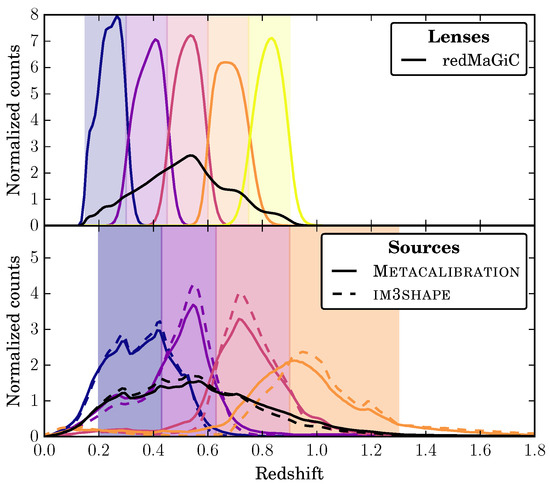 Photometric redshift distributions for the galaxy position (lens) and shear (sources) catalogs. The shaded regions mark the redshift bins: galaxies are divided according to their mean photo-z estimate. The redshift distributions of galaxies in each bin is shown with colored lines, while their overall redshift distributions with black lines. While the lens galaxies are analyzed using only one pipeline (redMaGiC), source galaxies are analyzed with two pipelines (IM3SHAPE and METACALIBRATION). From Abbott et al. [7].
