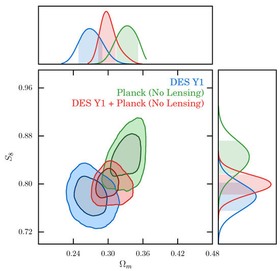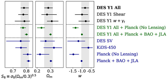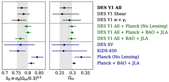 The data vectors were defined using scale cuts to mitigate non-linear bias effects and it comprises 457 entries (different redshift bins, angular bins, correlation functions). We used a theoretical (halo-model based) covariance matrix (dimension 457 × 457) computed with the CosmoLike code validated with 800 lognormal mocks. For the Markov Chain Monte Carlos (MCMC) analysis we had 20 nuisance parameters (related to the redshift uncertainty, galaxy bias, intrinsic alignment and shear calibration) in addition to the usual 6 cosmological parameters for the spatially flat CDM model (7 for wCDM, where w is defined in Equation (1)). We concentrate the analysis on the two most sensitive parameters: and , where is the matter density parameter and is the root mean square mass fluctuation on a scale of Mpc. The matter density parameter is defined according to , where is the present-day matter density and the present-day critical density is given by , where is the Hubble-Lemaître constant and G is Newton’s gravitational constant. We also compare results from DES alone with DES combined with data such as CMB, BAO and SNIa, see Figure 4.