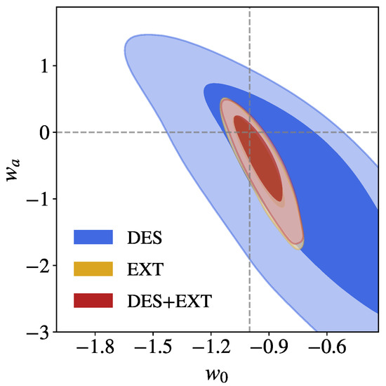 The contours show the 1- and 2- constraints for the dark energy equation of state parameters and of Equation (1) obtained from DES and other experiments. From Abbott et al. [20].