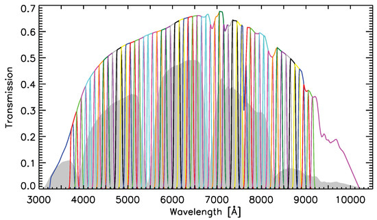 The transmission curves that characterize the quasi-spectroscopy of J-PAS. Shown are the 54 narrow-band and 2 medium-band filters that span the optical range (color lines). The narrow-band filters feature a width of 145 Å and are spaced by 100 Å. Also shown (gray areas) are the five SDSS filters. From Reference [23].