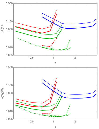 About 90 million luminous red galaxies (LRG) and emission line galaxies (ELG) (up to ) and 2 million quasars (up to ) are expected to be detected. Figure 10 and Figure 11 show the corresponding forecasts. See also References [24,25] where constraints using the multi-tracer method are discussed.