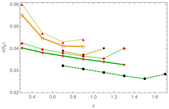 Forecasted constraints on the growth of structure () relative error from the galaxy catalogs produced by J-PAS (thick solid lines for , thin solid lines for ) as compared with DESI (dashed lines, ). LRGs in mustard and ELGs in green. f is the growth rate of matter perturbation. Redshift bins of are used [26].