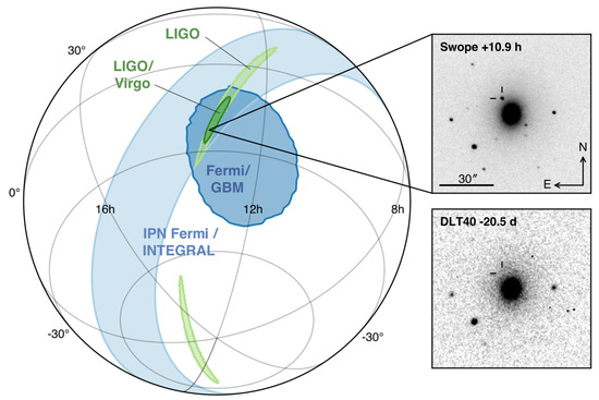 - Coulter, D.A.; Foley, R.J.; Kilpatrick, C.D.; Drout, M.R.; Piro, A.L.; Shappee, B.J.; Siebert, M.R.; Simon, J.D.; Ulloa, N.; Kasen, D.; et al. Swope Supernova Survey 2017a (SSS17a), the Optical Counterpart to a Gravitational Wave Source. Science 2017, 358, 1556. [Google Scholar] [CrossRef] [PubMed]