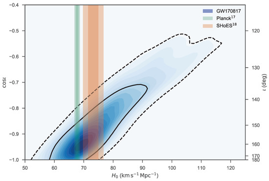 - Abbott, B.P.; Abbott, R.; Abbott, T.D.; Acernese, F.; Ackley, K.; Adams, C.; Adams, T.; Addesso, P.; Adhikari, R.X.; Adya, V.B.; et al. A gravitational-wave standard siren measurement of the Hubble constant. Nature 2017, 551, 85–88. [Google Scholar]