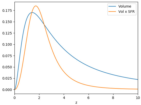 Bare volume factor with respect to redshift (blue) and volume factor times the realistic star formation rate of Madau and Dickinson [68].