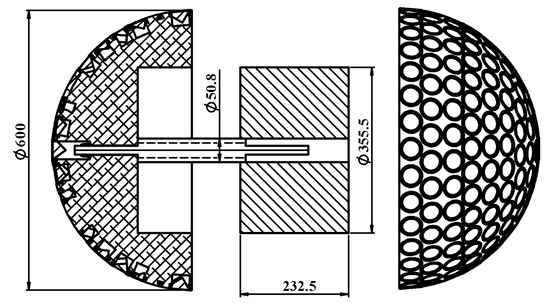 The LAGEOS satellites assembly as we obtained in Reference [38]. The main parts of the structure are shown: (i) two aluminum hemispheres containing the Corner Cube Retroreflectors (CCRs), (ii) the brass core, which increases the satellite mass, (iii) the copper-beryllium shaft that fastens the different parts of the satellites. Dimensions are in mm. This figure was redrawn to be similar to the historical one reported in Reference [36], well known in the literature of the older LAGEOS, but the quotes are different, as derived by our analysis [38].