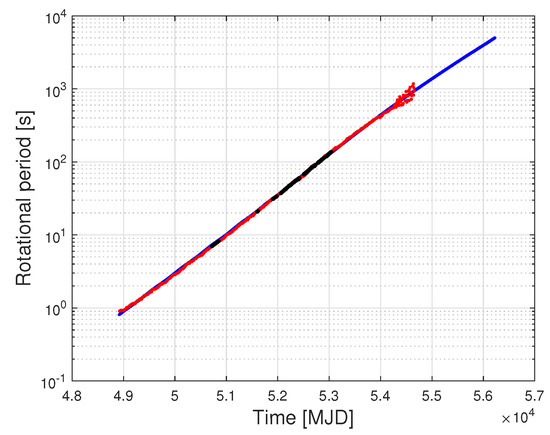 In Figure 2 and Figure 3 we show, as an example for LAGEOS II, the two equatorial components () of the spin direction of the satellite at different times, the time evolution of the projection of the spin direction along the vertical axis, and the time evolution of the satellite rotational period P, respectively. The time span considered is about 20 years since the launch of LAGEOS II. In these figures we compare the predictions of the model (blue dots) with the available observations (in red those spectrally determined from the SLR data [43], and in black the collection of previous observations as reported in Reference [44]).