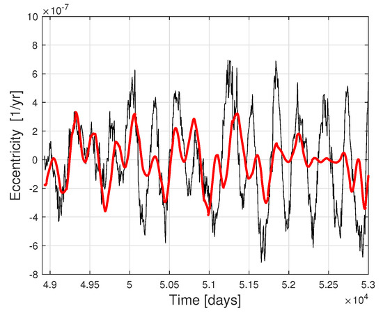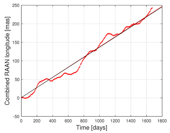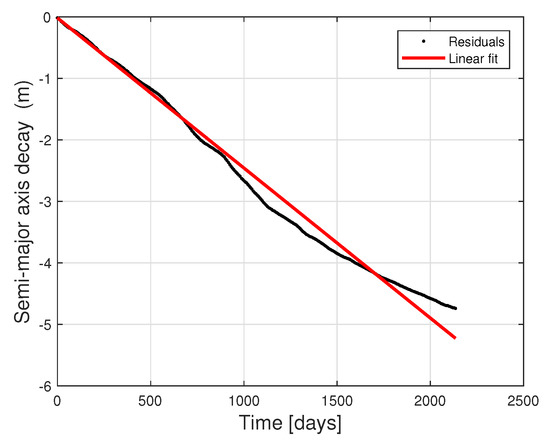 Beside this direct effect on the satellite’s node due to the out-of-plane acceleration produced by the neutral drag perturbation, it is worth of mention that there are also two indirect effects to be considered. One of these arises from the effects of the drag perturbation on the satellite inclination i. As well known in the literature, the inclination is subject to a secular effect produced by the out-of-plane acceleration due to the neutral drag [58,59,60,61]. However, this effect enters in Equation (1) by means of a trigonometric function and, consequently, does not produces any secular effect in the time behaviour of the precession of the RAAN of the satellite [62]. A second indirect effect on this observable, and in principle more significant than the one produced by the secular variation of the inclination, is that produced by the decay itself of the satellite semi-major axis. We shall return on this feature in Section 4.2.