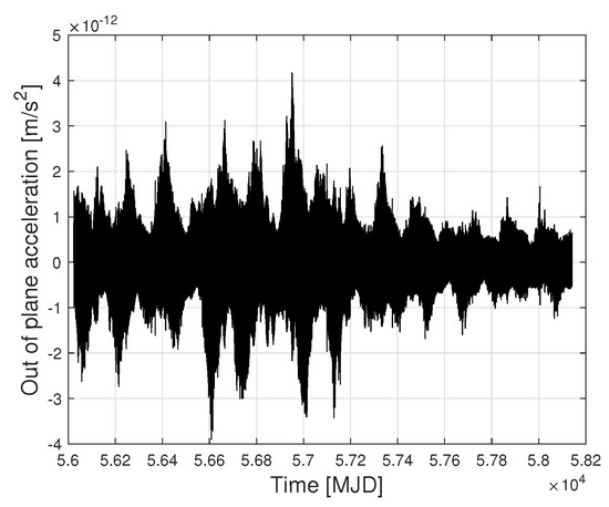 where H represents the osculating angular momentum per unit of mass, r the satellite distance from the Earth’s geocenter, while i and f are, respectively, the satellite inclination and true anomaly. In Figure 6 and Figure 7, the out-of-plane acceleration and the corresponding perturbing effects on the RAAN of LARES on a time span of about 5.8 years after the launch of the satellite are shown.