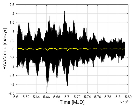 The time evolution of the perturbing acceleration has been computed with SATRAP, as previously described, using the MSIS-86 model for the neutral atmosphere. As we can see, this component of the drag perturbing acceleration is very small. It is characterized by a main oscillation at the orbital period of the satellite (about 1.9 h), further modulated by a long period oscillation of about 133 days. The maximum peak amplitude is a few pm/s, with a mean value (on the considered time span) of about m/s, negligible with respect to the average value obtained for the transverse acceleration T. The effects produced by the out-of-plane acceleration on the precession of the RAAN of LARES are negligible. The oscillations at half of the orbital period of the satellite are characterized by amplitudes not larger than a few mas/d, with a mean value on the considered time span of about mas/d. As shown in Figure 7, a smoothing at 1 day (the yellow line) clearly highlights this very small impact, with a mean value practically coincident with the one computed with the non-smoothed data.