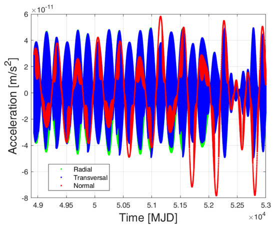 In the following, we provide as an example our new results for LAGEOS II in the case of the simplified thermal model applied to the solar Yarkovsky-Schach thermal effect. The analysis was performed on a time span of 4080 days, starting from 25 October 1992 (MJD 48920). The LASSOS general (non averaged) model has been used for the satellite spin evolution [42], see Section 2.2. In Figure 8 we show the perturbing accelerations in the Gauss reference frame, that is, the radial (green), transversal (blue) and normal, or out-of-plane (red), components of the Yarkovsky-Schach acceleration. These results are in agreement with those obtained by Reference [44] and based on a more general thermal model, but with an averaged spin evolution.