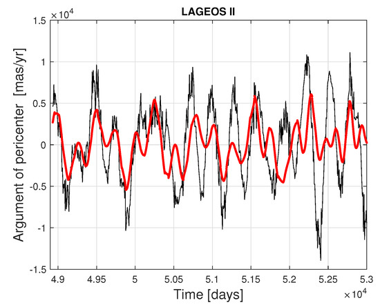 Yarkovsky-Schach effect on the rate of change of LAGEOS II argument of pericenter. The predictions of the simplified thermal model (red line) are compared with the residuals in the argument of pericenter (black line) obtained by means of a POD performed over the same time span of 4080 days.