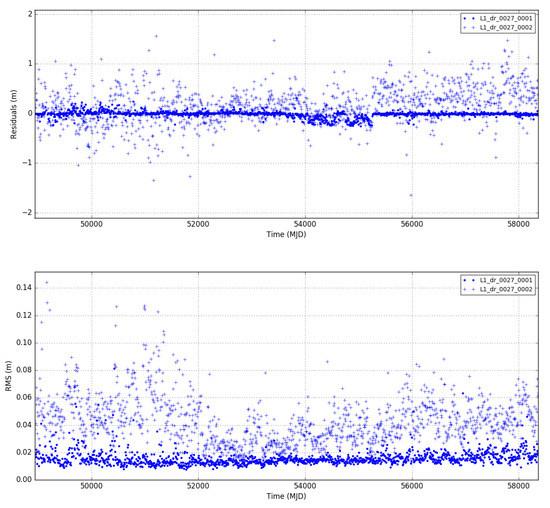 LARES POD results. Top: Range residuals. Bottom: RMS of the range residuals.