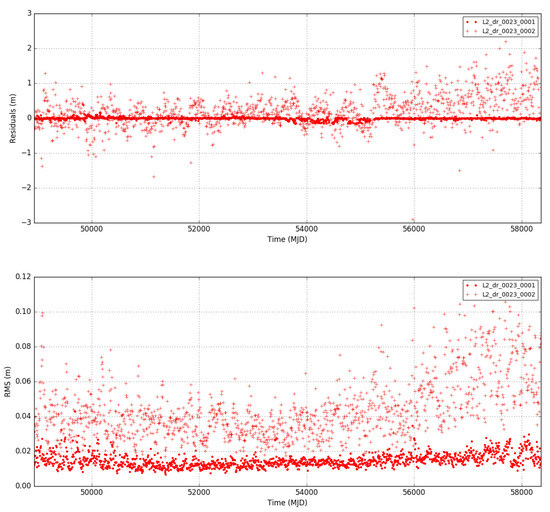The first plot of each figure shows the range residuals of the three satellites, while the second plot shows their RMS. The range residuals are computed as mean values over each arc for all the stations that perform the tracking of the satellite. The RMS represents, again for each arc, the weighted RMS (i.e., taking into account the number of observations and the degrees of freedom) of the corresponding (mean) range residual. Clearly, for the second evaluation, with no empirical accelerations, the scatter of the residuals is larger, and so their RMS is.