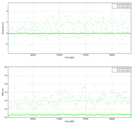 Within LARASE, our strategy is to extract the relativistic effects, in particular the GR precessions, not from the range residuals of the satellites—which indeed represent the true observables that we obtain from the data reduction of the SLR data— but from the residuals in the orbit elements. This approach, which is the one followed in all previous measurements of the GR effects with the LAGEOS satellites, has the main advantage of explicitly measuring the orbital effects predicted by GR or by other theories of gravitation [26,27,28]. Traditionally, the first approach is preferred if one is more interested to estimate a (solve-for) parameter related with an effect explicitly modelled in the dynamical model [87].
