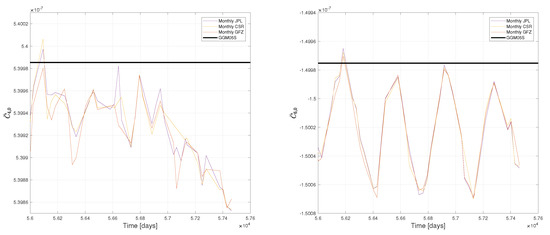 We believe that this was mainly due to the imperfect knowledge of the gravitational field of the Earth, as also highlighted by other authors, but with some differences with respect to previous considerations on the subject [117]. In particular, we believe that the main problem in this context is the inadequate modelling of the time evolution of the even zonal harmonics. This also strongly influence the correct comparison between different models for the gravitational field of the Earth, producing wrong conclusions on their reliability. Moreover, also the non-linear fits performed (in previous measurements of the LT effect) on the integrated residuals of the combined orbits, have contributed to absorb part of the errors due to the uncertainties of the even zonal harmonics. For instance, in Reference [24] we have shown that the sensitivity to the number of periodic effects removed by a non-linear fit was significant, between a minimum of about 3% to a maximum of about 7% of the relativistic LT precession. In what follows, we will show that this result was mainly due to the static value of the third even zonal harmonic, , of the GGM05S model on the the considered time span. Moreover, if the time span of the analysis of the satellites orbit (i.e., their data reduction during the POD) is long enough, it will be preferable to perform a simple linear fit of the integrated residuals of the combined right ascensions of their ascending nodes, instead of a more complex non-linear fit.