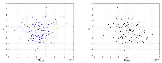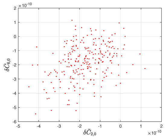 In the case of two satellites in exactly supplementary orbital configuration, the relativistic LT precession on the right ascension of their ascending node are equal, while the corresponding secular precession due to the Earth’s deviation from the spherical symmetry are equal and opposite, because they are both proportional to the cosine of the orbit inclination i, see Equations (2) and (4). Indeed, the even zonal multipolar moments of the Earth gravitational potential [109,110,111]—that measure the deviation of the Earth’s mass distribution from spherical symmetry—produce a Newtonian precession of with the same signature of the sought for effect [15,20,76,78,112]. These moments are described by the even zonal harmonics ; for instance, in the case of the quadrupole moment () we have [109]: