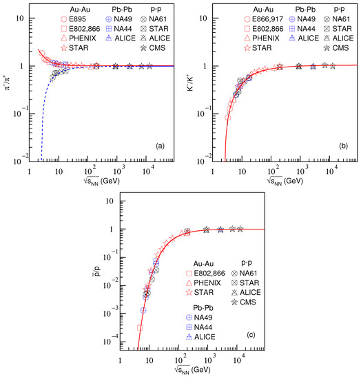 The yield ratios, , , and , of antiparticles to particles produced in mid-rapidity interval (in most cases) in central Au–Au, central Pb–Pb, and INEL or NSD collisions at the AGS, SPS, RHIC, and LHC are shown in Figure 1a–c, respectively. The circles, squares, triangles, and stars denote the data measured in Au–Au collisions in mid-rapidity interval from to and centrality 0–5% by the E895, E866, and E917 Collaborations [13,14,15] at the AGS; in mid-rapidity interval and centrality 0–10% by the E802 and E866 Collaboration [16,17] at the AGS; in mid-pseudorapidity interval and centrality 0–5% by the PHENIX Collaboration [18,19,20]; and in mid-rapidity interval from to and centrality from 0–5% to 0–10% by the STAR Collaborations [3,21,22,23] at the RHIC, respectively. The circles, squares, and triangles with aclinal crosses denote the data measured in Pb–Pb collisions in mid-rapidity interval from or to and centrality from 0–5% to 0–7.2% by the NA49 Collaboration [24,25,26,27] at the SPS; in mid-rapidity interval from to and centrality 0–3.7% by the NA44 Collaboration [28] at the SPS; and in mid-rapidity interval and centrality 0–5% by the ALICE Collaboration [29] at the LHC, respectively. The circles, squares, triangles, and stars with diagonal crosses denote the data measured in the forward rapidity region (in the center-of-mass system) in INEL collisions by the NA61/SHINE Collaboration [30] at the SPS; in mid-rapidity interval in NSD collisions by the STAR Collaboration [3,31] at the RHIC; in mid-rapidity interval in INEL collisions by the ALICE Collaboration [32] at the LHC; and in mid-rapidity interval in INEL collisions by the CMS Collaboration [33,34] at the LHC, respectively. The solid and dashed curves in Figure 1a are the results fitted by us for the dependent in central Au–Au (Pb–Pb) and INEL or NSD collisions, respectively. The solid curves in Figure 1b,c are the results fitted by us for the dependent and , respectively, for the combined central Au–Au (Pb–Pb) and INEL or NSD collisions.