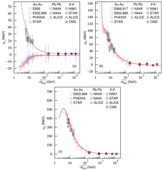 Figure 2a–c presents, respectively, the chemical potentials , , and , of , K, and p produced in mid-rapidity interval (in most cases) in central Au–Au (Pb–Pb) and INEL or NSD collisions at high energies. The symbols denote the derivative data obtained from Figure 1 according to Equation (5), where different symbols correspond to different collaborations marked in the panels, which are the same as Figure 1. For the purpose of comparison, the normal, medium, and small symbols with diagonal crosses denote the derivative data in INEL or NSD collisions obtained by , , and in Equation (5), respectively, since the chemical freeze-out temperature in collisions is not available. The curves are the derivative results obtained from the curves in Figure 1 according to Equation (5). The solid and dashed curves in Figure 2a are the derivative results for central Au–Au (Pb–Pb) and INEL or NSD collisions, respectively. The solid curves in Figure 2b,c are the derivative results for the combining central Au–Au (Pb–Pb) and INEL or NSD collisions. One can see that, with the increase of over a range from above a few GeV to above 10 TeV, increases obviously in central Au–Au (Pb–Pb) collisions and it decreases obviously in INEL or NSD collisions, while and decrease obviously in both central Au–Au (Pb–Pb) and INEL or NSD collisions. The limiting values of the three types of chemical potentials are 0 at very high energy. As derivative results from Figure 1, the difference and similarity in and Au–Au (Pb–Pb) collisions are natural due to the application of Equation (5).