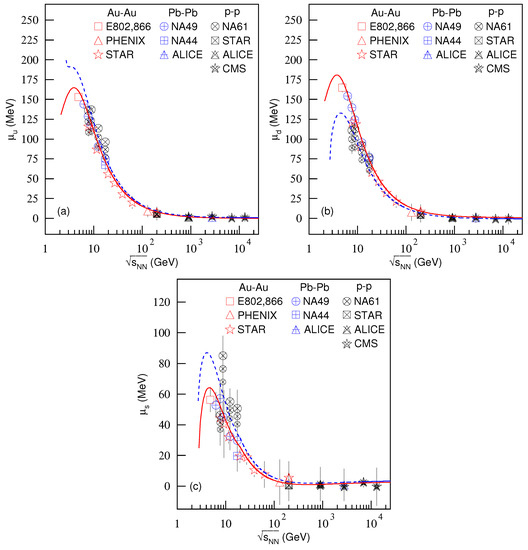 Figure 3 is the same as Figure 2, but Figure 3a–c presents, respectively, the chemical potentials, , , and , of u, d, and s quarks, which are derived from mid-rapidity interval (in most cases) in central Au–Au (Pb–Pb) and INEL or NSD collisions at high energies. The symbols denote the derivative data obtained from Figure 1 according to Equation (6), where different symbols correspond to different collaborations marked in the panels which are the same as Figure 1 and Figure 2. For the purpose of comparison, the normal, medium, and small symbols with diagonal crosses denote the derivative data in INEL or NSD collisions obtained by , , and in Equation (6), respectively. The curves are the derivative results obtained from the curves in Figure 1 according to Equation (6), where the solid and dashed curves are for central Au–Au (Pb–Pb) and INEL or NSD collisions, respectively. One can see that, with the increase of over a range from above a few GeV to above 10 TeV, , , and decrease obviously in both central Au–Au (Pb–Pb) and INEL or NSD collisions. The limiting values of the three chemical potentials are 0 at very high energy.
