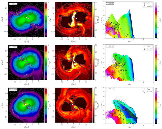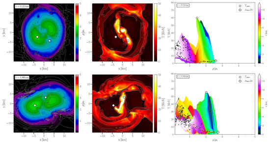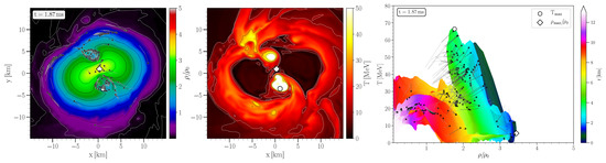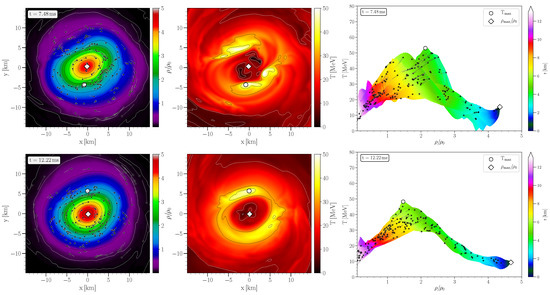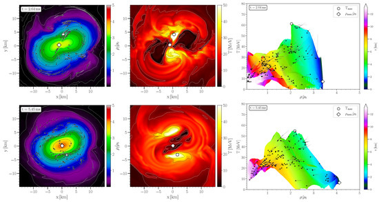 The pictures in the right column depicts the density-temperature profiles inside the inner region of the HMNS in the style of a (T-) QCD phase diagram plot. The color-coding indicates the radial position r of the corresponding fluid element inside the HMNS. The white circles/diamonds mark the maximum values of temperature/density. Additionally, using the method of a “corotating frame”, several tracer particles that remain close to the equatorial plane are visualized with black dots. The final part of the tracer flowlines for the last ms are shown and the small black dots indicate the tracer position at the time indicated in a frame (for details see [16,74]). At , the tracers have been placed near to the surface of the newly born remnant and, as time evolves, the tracer particles diffuse over the entire region of the HMNS. In the following, only the tracer particles that remain in the interior of the remnant are visualized, while tracers leaving the HMNS are neglected. The violent, early post-merger phase (Disco-fox phase) is characterized by a pronounced density double-core structure and hot temperature regions which are smeared out in areas between the double-core density maxima (see Figure 1). At merger time, the center of the HMNS is highly compressed (), the corresponding large pressure pushes the matter away from the center, and a double-core structure in the density profile appears (see Figure 1). The temperatures near to the two centers of the double-core is quite small and the high temperature values are reached in the middle of the double-cores. As a result of this dynamical process, the density and pressure values in the center of the HMNS decrease, the gravitational force again compresses the system, and the extent of the double-core shrinks (see Figure 2). The results shown that, within the early post-merger phase, the evolution of matter is quite violent and the density of a fluid cell (tracer particle) can show large variations of order 100% on a timescale of milliseconds. As a result, significant bulk viscous dissipation may occur [20].