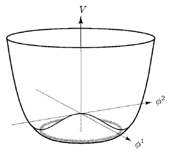 This Lagrangian clearly contains massless -fields and one massive field . Then there are broken generators and they correspond to the Nambu-Goldstone bosons which move along the degenerate vacuum showed in the Figure 1.