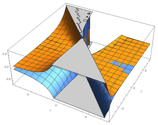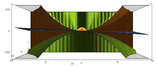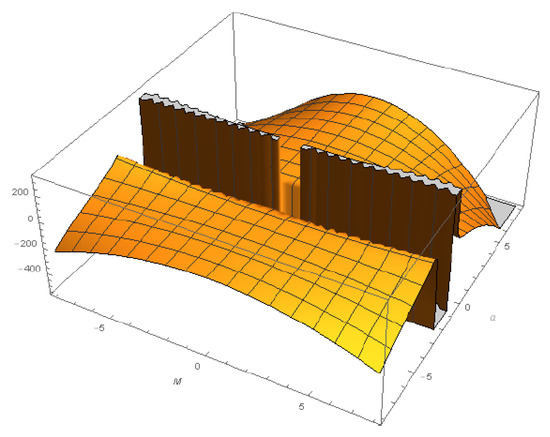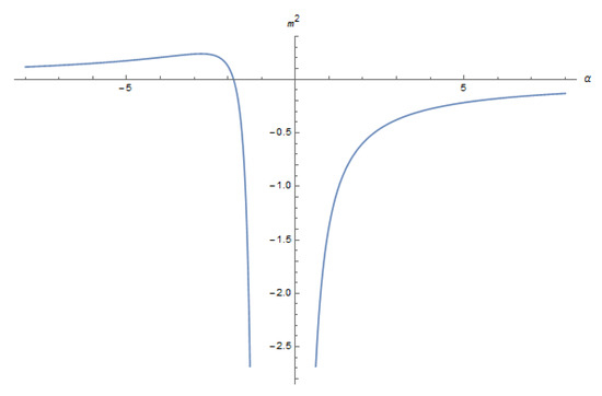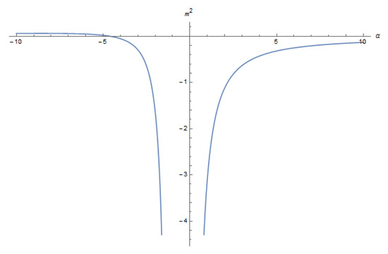 Compare this result with Equation (66). This matrix only represents two independent equations after developing the tensorial product. The result (73) represents the graviton masses for the different modes. However, again we have a single vacuum state (once we fix the parameters) since there is no path of the extra-degrees of freedom (Nambu-Goldstone bosons) appearing through a non-trivial function . In other words, there is no gauge field associated to the graviton mass in this case and since the vacuum is unique, in this special situation we do not have any dynamical origin for the graviton mass. There are two different eigenvalues for the matrix Equation (73). They are represented in Figure 7 and Figure 8. Note that both eigenvalues can be zero for some specific values taken by the parameter .