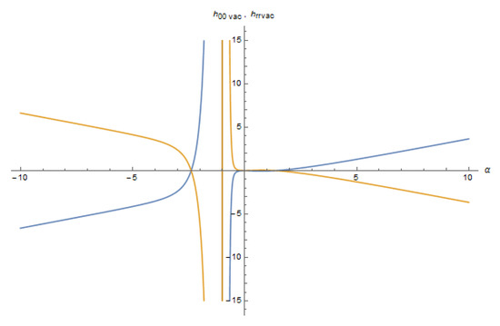 The vacuum state representative for the potential (70) as a function of the free-parameter . The blue line corresponds to the component of the graviton field. The yellow line corresponds to the component . Note that in general the trace is non-zero. It becomes zero for the case ( and )obtained for two different values of the parameter . The condition is assumed even if in the figure this constraint does not appear explicitly.
