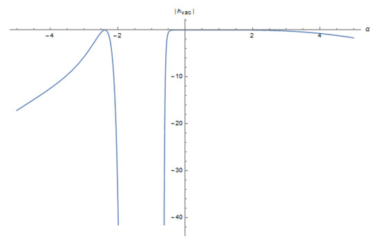The determinant of the vacuum matrix corresponding to the graviton field h and the solutions (72). Note that the determinant vanishes for some specific values of , consistent with the vanishing values of and .
