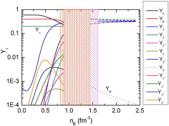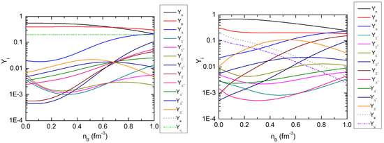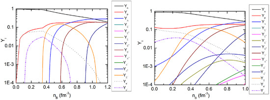 As can be seen, quark flavor mixing shifts the hadron-quark phase transition toward a smaller baron number density. This trend is to be expected from the results for the particle densities shown in Figure 8, which shows that flavor mixing shifts the presence of quarks to lower densities.