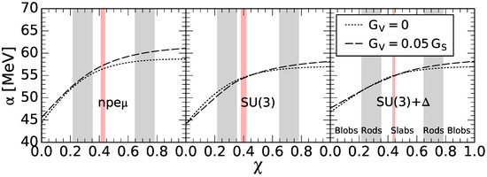 where and denote the pressures of hadronic matter and quark matter, respectively [1,2]. The quantities and in Equation (24) collectively denote the field variables of hadronic (, , ) and quark (, , ) matter as well as the Fermi momenta (, ) that characterize a solution of the equations of hadronic matter described in Section 2. The quantity describes the volume proportion of quark matter, , in the unknown volume V. , therefore, varies between 0 and 1, where 0 means that 0% quark matter is present and 1 means that the matter consist of 100% quark matter. Equation (24) is solved subject to the conditions of global baryon number conservation and global electric charge conservation. The global conservation of baryon charge is expressed as [1,2]