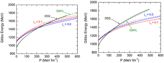 where the sum over j is over all the particles present in each phase. Figure 7 shows the Gibbs energy of hadronic matter and quark matter as a function of pressure. A sharp (Maxwell-like) first-order phase transition is assumed. Values of and have been chosen for the ratio of the vector-to-scalar quark coupling constant to demonstrate the dependence of the Gibbs energy on the repulsion among quarks. The points where the curves cross each other mark the location of phase equilibrium between hadronic and quark matter.