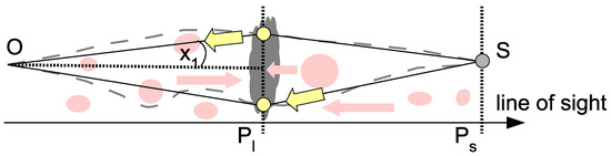 Based on the physical prerequisites of Section 2 and the detailed derivation in [27], we set up the standard gravitational lensing formalism for one lens plane as follows. First, the light propagation along the line of sight is divided into the light propagation through the flat FLRW metric and the light deflection at the lens plane. Relative to the unperturbed light ray that propagates along a null-geodesic of the background metric, let the light be subject to a time delay due to the deflection in the lens plane. Due to this deflection, the light also travels the additional time in the flat FLRW metric relative to the unperturbed ray. Minimising the total travel time with respect to an unperturbed light ray, , we obtain