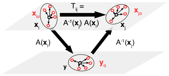 holds. As the distortion matrix is assumed to be constant over the area spanned by the reference points, and represent an arbitrary point within this area. Reformulating the part on the right-hand side of Equation (10) yields a linear transformation between vectors in image j to vectors in image i as