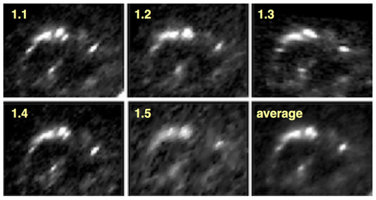 The work in Ref. [62] already described the possibility to extract the local lens properties contained in by transforming multiple images onto each other. In [23,47], we realised this idea for unresolved and resolved multiple images that contain at least two non-parallel vectors, as indicated by the black arrows in the figures of Table 1. We assume to have m reference points within each multiple image i which are located at positions , . Using the quadrupole of an unresolved image as observables, the three reference points are the centre of light and the end points of the semi-major and semi-minor axis of the quadrupole. Furthermore, we assume that the multiple images have a very small extent compared to the scale on which the mass density changes. Section 3.2 and Section 3.3 show the validity of this assumption in two practical applications on cluster and on galaxy scale. This implies that the entries in are approximately constant over the area spanned by the in each multiple image. Since the vectors in all multiple images , , originate from the same, corresponding vectors in the source plane, we note that for each of these vectors