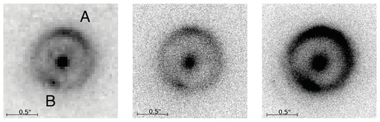 denotes the convergence of the axisymmetric part of the potential at . is the deflection angle caused by the perturber. can be the difference between the observed radial positions of arcs A and B. Alternatively, the difference between the radial positions of the centre-close and centre-far isophote delineating one arc can also be inserted as . Dividing Equation (31) for the radial differences of the delineating isophotes of arc A by the same equation for arc B, we arrive again at Equation (12). Since this procedure maps the two arcs onto each other, it is not surprising that the ratio of Equation (31) of arc A to B is a special case of Equation (12) for lenses with almost axisymmetric mass-density distributions.