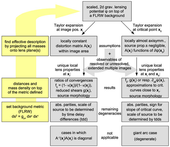In principle, there are other ways to describe the deflection of light rays in our universe which are detailed in [27]. For instance, the approach in which the background metric accounts for the entire deflecting mass-density distribution is an equivalent ansatz. However, determining the geodesics in such an inhomogeneous universe is more difficult than treating gravitational lensing in an effective theory based on lens planes in a homogeneous and isotropic background cosmology. Another option partitions the mass density along the line of sight into a main deflecting object and small-scale perturbations scattered along the light path in an FLRW background metric without projecting the masses to lens planes.