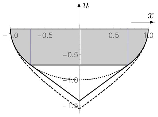 - Creation from nothing through tunneling. It is interesting to look into the question of whether a tunneling solution of Equation (8) is also possible when , as in the HH-approach, forms a semicircle (page 86 of Ref. []) so that no point is distinguished. Accordingly, we demand the validity of the equationand determine from Equation (8) in such a way that Equation (12) is satisfied. From the latter follows . Inserting this in Equation (8), eliminating u by use of Equation (12), and resolving with respect to yieldsThis treatment of the QR is an approximation which is getting worse the deeper one gets into it. In that sense, the negative values of the density may perhaps not be taken seriously. However, for , a singularity appears that is just what should be avoided in a quantum treatment.There are two ways to get out of this situation with a viable solution.1. the solution (13), yielding in the range , is continued into the range by a straight line with the slope following from Equation (8) for .2. The solution (13) is cut off at .Both possibilities are shown in Figure 1. The truncated HH-like solution, supplemented by two straight lines, has a peak which constitutes a distinguished point and must therefore be regarded as a tunneling solution of the VL-type. It represents an alternative to the solution (45) of Ref. [], or , but does not comply with the HH-concept.